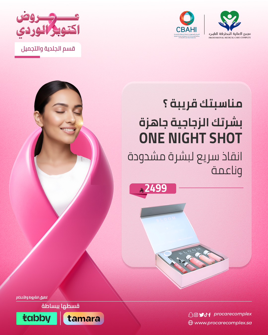 احصلوا على بشرة مشدودة وشابة مع جلسة الإنقاذ الساحرة للبشرة ONE NIGHT SHOT في عروض قسم الجلدية والتجميل بمجمع العناية المحترفة الطبي جازان.